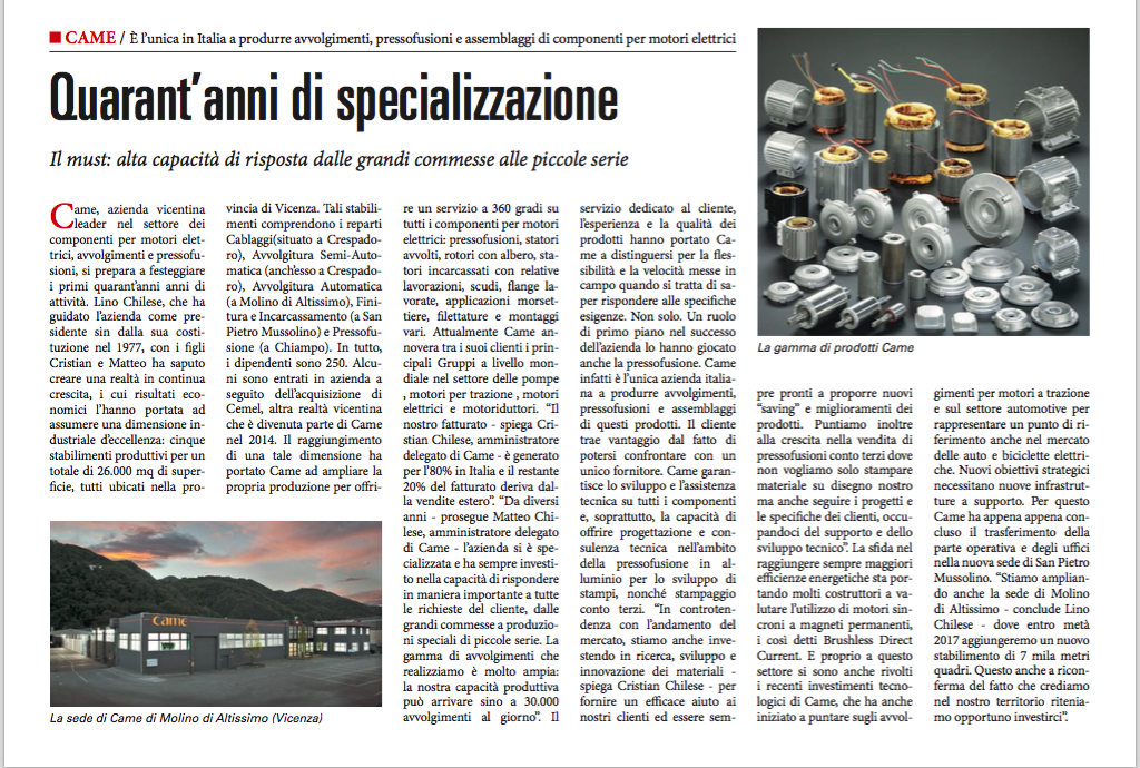 Siamo orgogliosi di comunicare che il giornale Eventi Nordest del Sole 24 Ore ha dedicato un articolo a Came per i suoi quarant’anni di attività, attribuendo una nota di merito all’eccellenza veneta nel mondo, per la produzione di avvolgimenti, pressofusioni e assemblaggi di componenti per motori elettrici grazie ai suoi quarant’anni di continue specializzazioni e alla sua alta capacità di risposta sia alle grandi commesse che alle piccole serie.